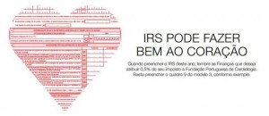 Ao efectuar a sua Declaração de IRS ajude-nos, atribuindo 0,5% do valor liquidado do seu IRS à nossa causa. Para tal, quando preencher o modelo 3 da sua Declaração, deverá indicar o nome da Fundação Portuguesa de Cardiologia e o NIPC – 500 936 994, no campo reservado para o efeito. Deste modo, o valor será automaticamente canalizado para a Fundação, sem quaisquer encargos para si.