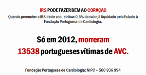 Ao apoiar a nossa causa não irá pagar mais IRS nem irá receber menos dinheiro. Assim,ao efectuar a sua Declaração de IRS ajude-nos, atribuindo 0,5% do valor já liquidado ao Estado. Basta preencher o quadro 9 do Anexo H, campo 901, indicando a Fundação Portuguesa de Cardiologia e o NIPC – 500 936 994. Deste modo, o valor será automaticamente … Continue reading IRS pode fazer bem ao Coração