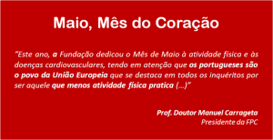 Este Mês de Maio a Fundação Portuguesa de Cardiologia recomenda a todos os cidadãos a prática de atividade física de intensidade moderada, meia hora por dia, pelo menos cinco dias por semana, para reduzir o risco de doença cardíaca. Basta para isso, por exemplo, andar meia hora a pé por dia.