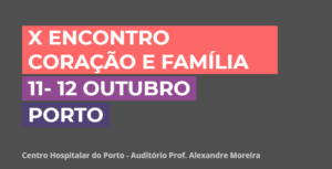 COMUNICADO Após o adiamento forçado do X Encontro Coração e Família, provocado pelo rebentamento de uma caldeira nas instalações do Hospital de Santo António, a Comissão Organizadora informa que já tem nova data: Dias 11 e 12 de Outubro, no Auditório Professor Alexandre Moreira do Centro Hospitalar do Porto. Porque já passaram alguns meses compreendemos … Continue reading X Encontro Coração e Família